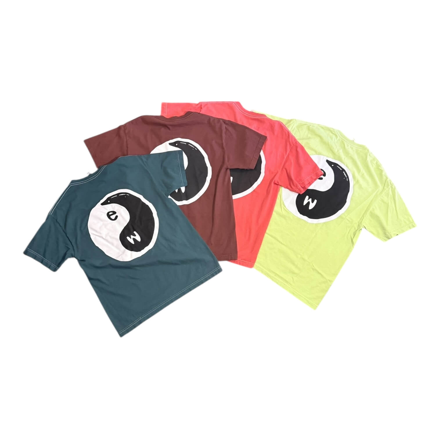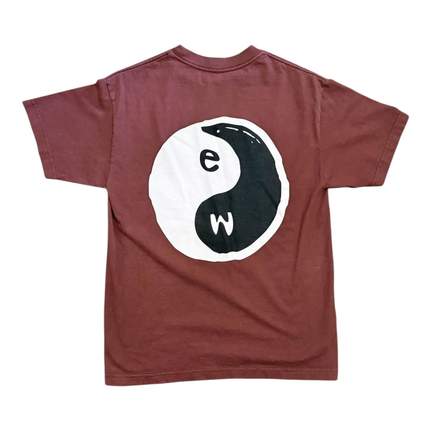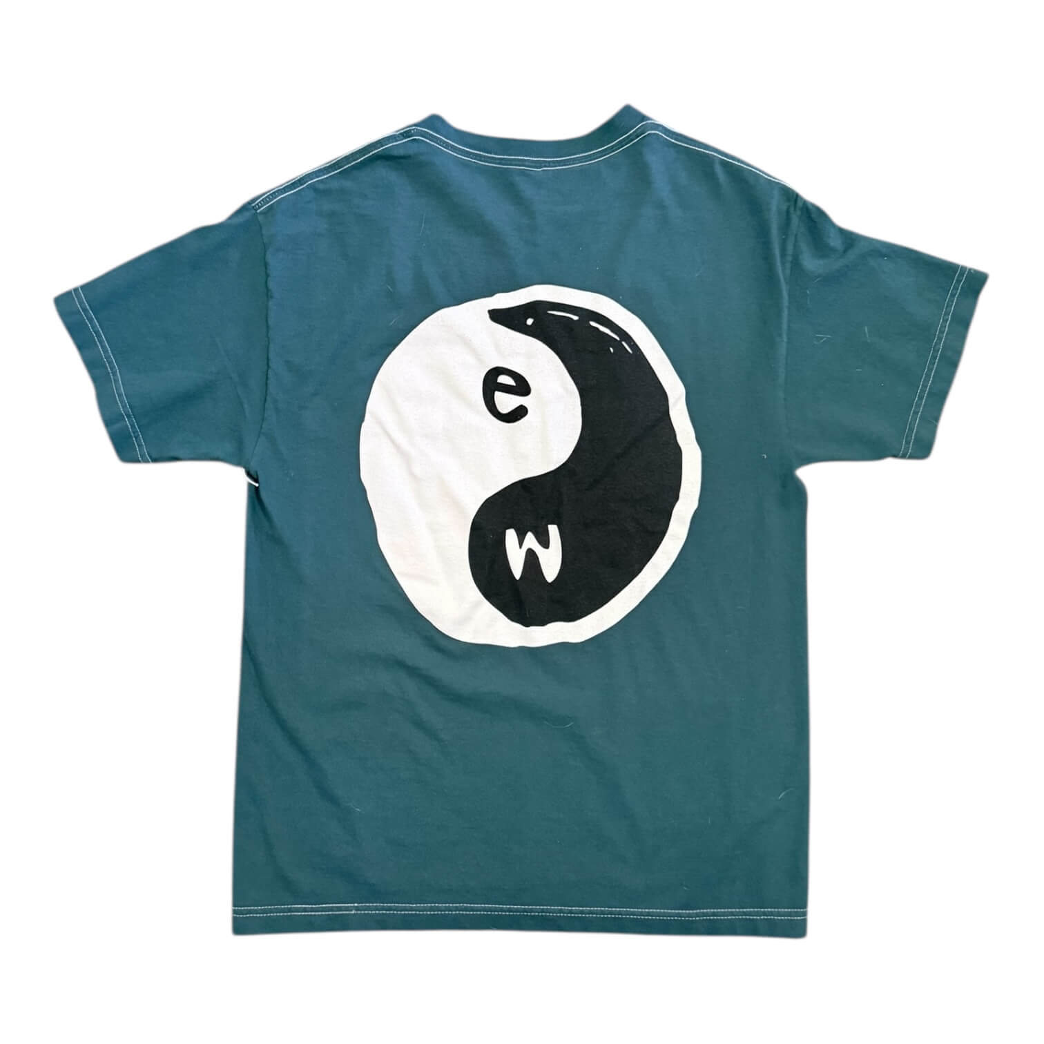 Printed on a shirts we rescued out of a garage and then garment dyed and printed.  A yin yang drawn by us - East/West - Yin/Yang - you can't have one without the other.