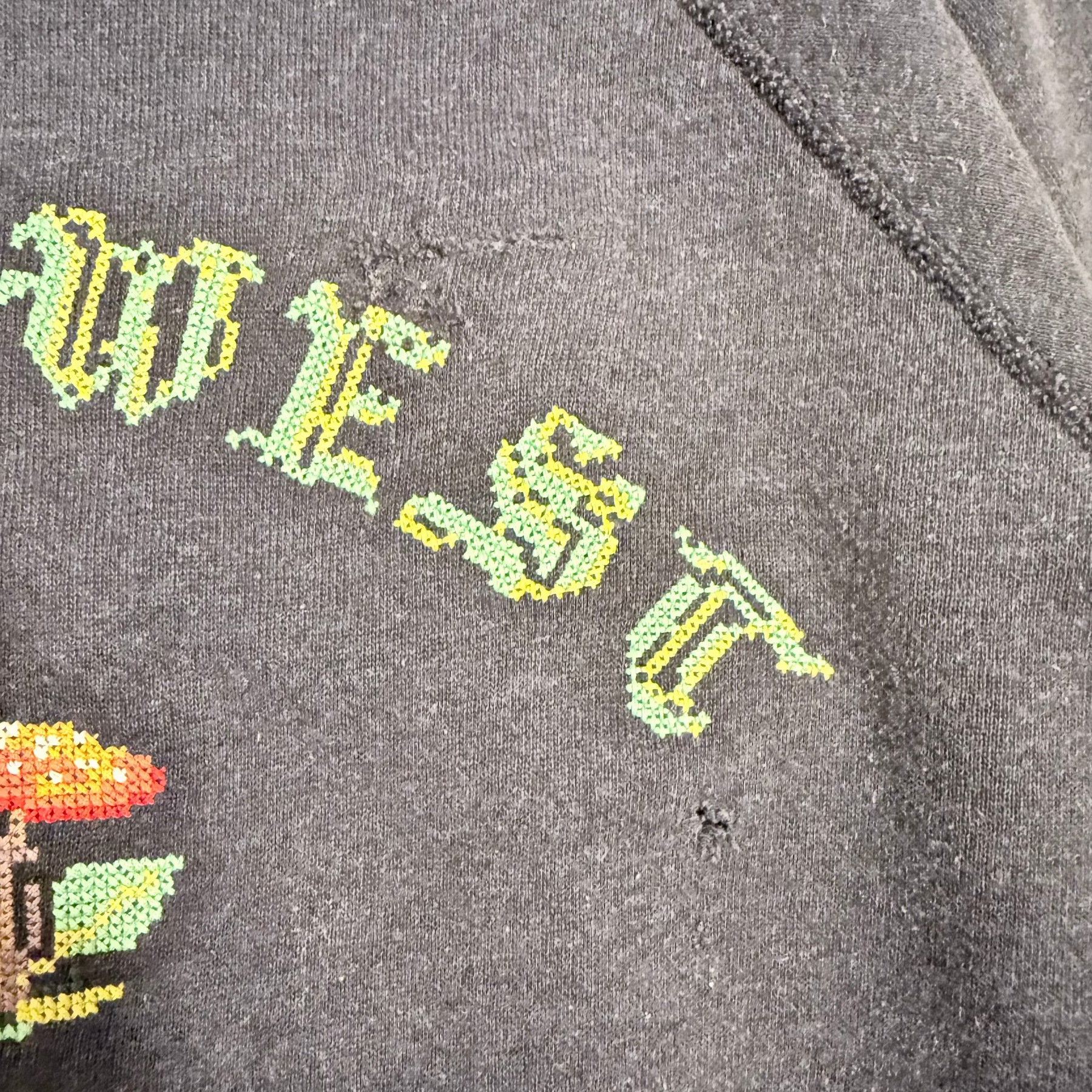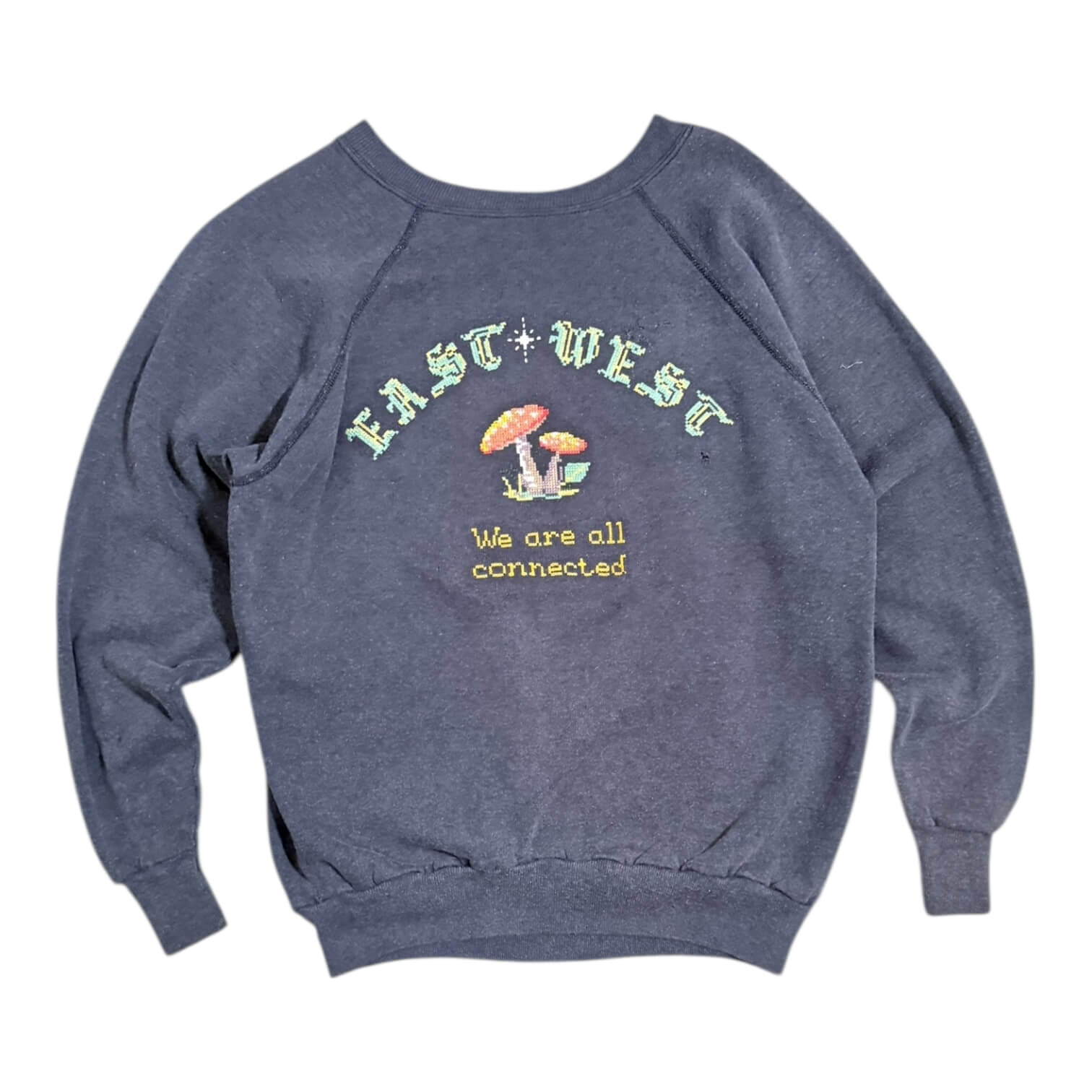 This a vintage Sweatshirt brought to new life with a cross embroidery done right here in LA. In good vintage condition. May be some small holes, marks and typical vintage wear. This particular piece has some small holes and a repair near the "E" in "West". Pics attached. The color is a dark charcoal heather with a slight blueish tint.